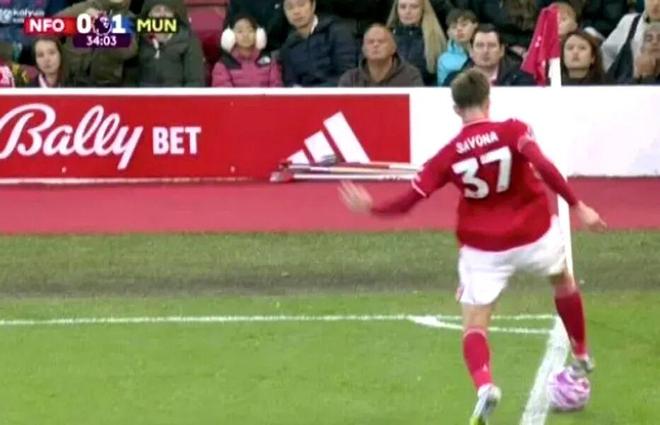 比赛形势因为主裁达伦·英格兰的一次误判发生了改变,尼科洛·萨沃纳在诺丁汉森林本队的底线上控制住了皮球,但裁判认为皮球已出界,给了曼联一记角球。